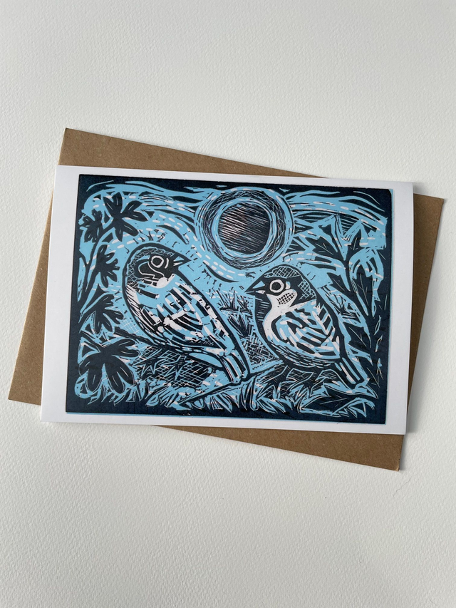 This card has been reproduced from my original linocut print and has been inspired by the birds and plants in and around my Devon garden.