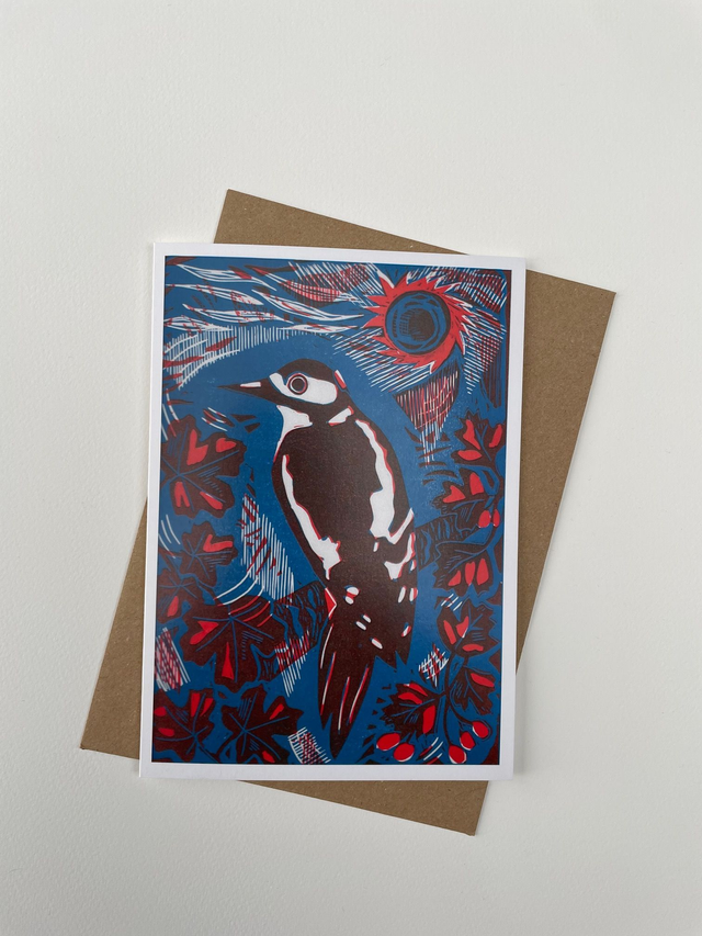This card has been reproduced from my original linocut print and has been inspired by the birds and plants in and around my Devon garden.